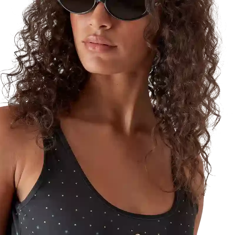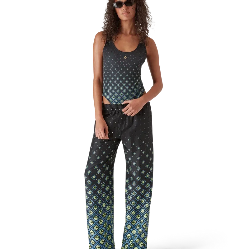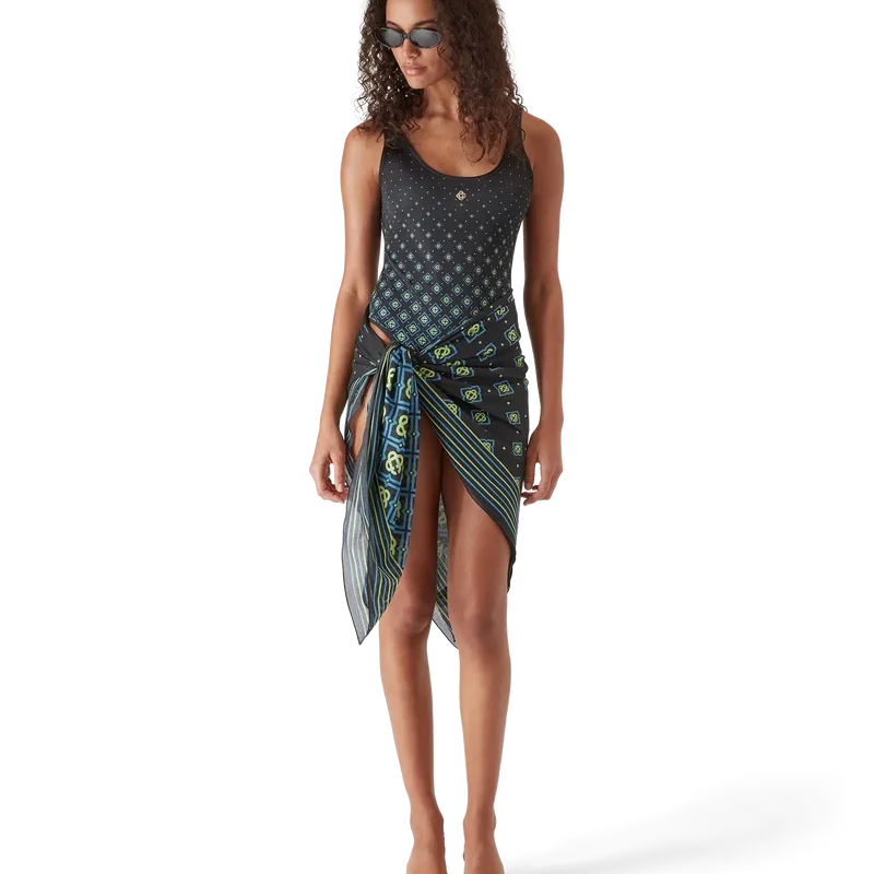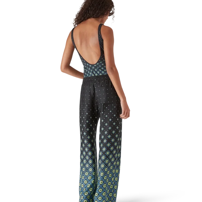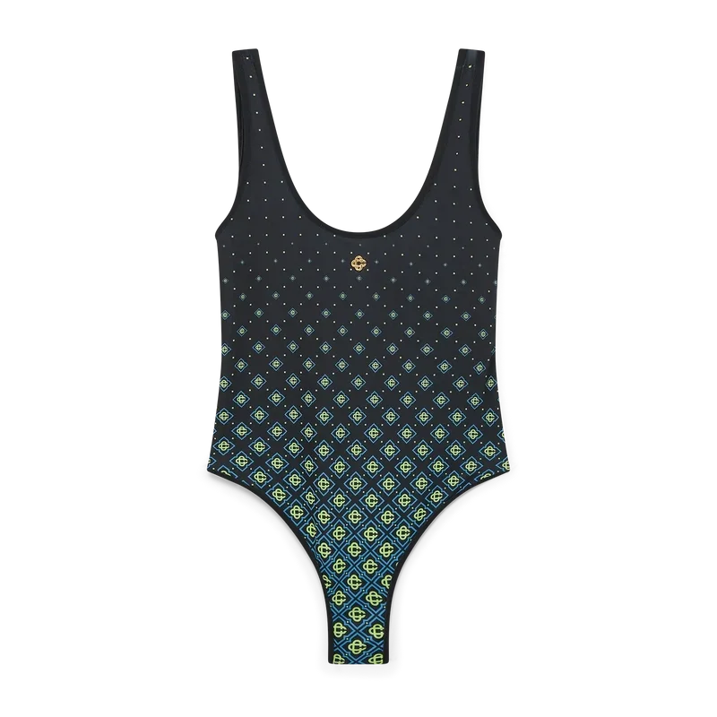 El traje de baño con estampado Monogram negro degradado es un diseño refinado que presenta el patrón Monogram negro característico de la casa. Se completa con el logotipo de diamante característico de la casa en el pecho, corte alto en las piernas, cuello redondo, espalda escotada y detalles en los bordes.