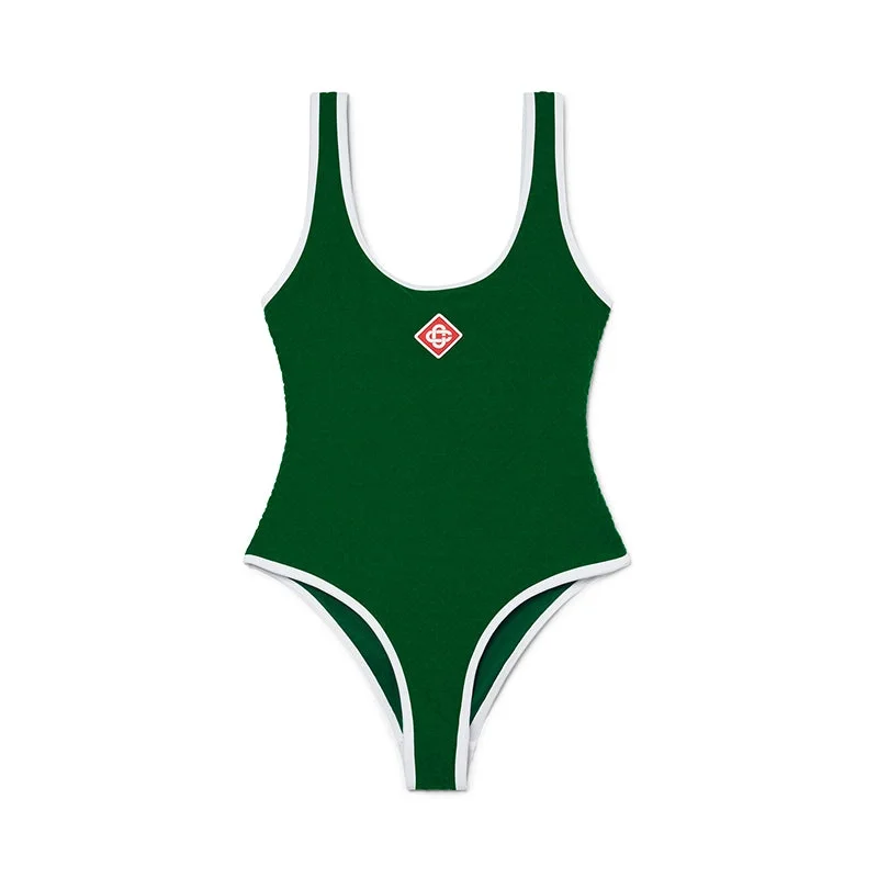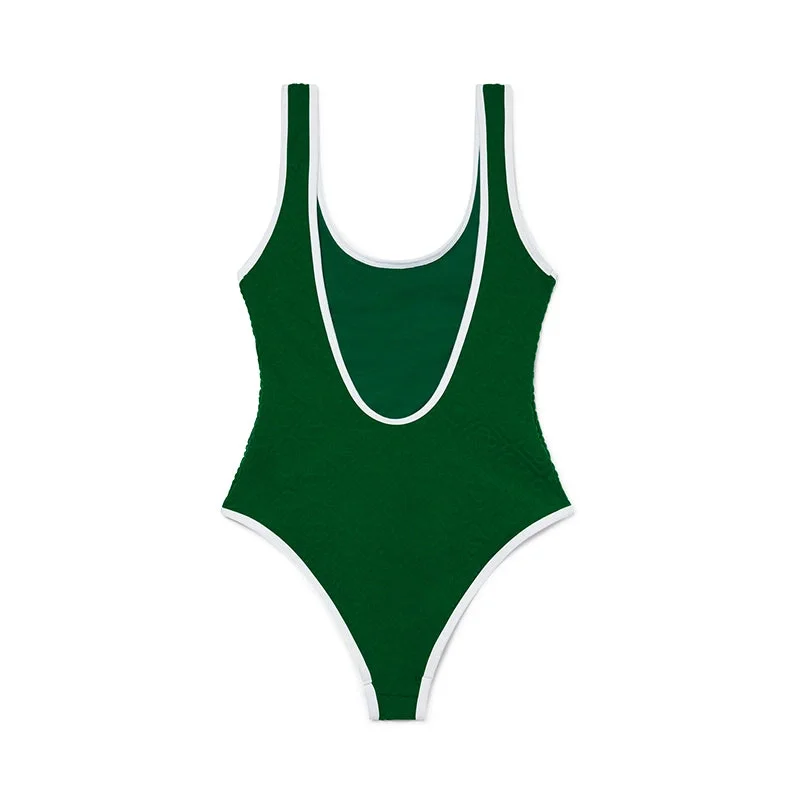 El traje de baño de una pieza Monogram verde presenta una silueta clásica con corte alto en las piernas y cuello redondo que le confiere un aire nostálgico. Confeccionado en jersey Monogram 3D, este modelo cuenta con ribetes blancos y el emblemático Diamond Monogram de la Maison en el pecho.