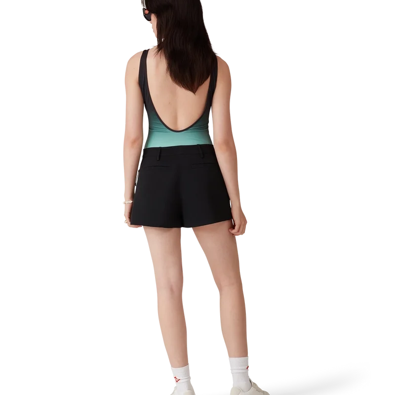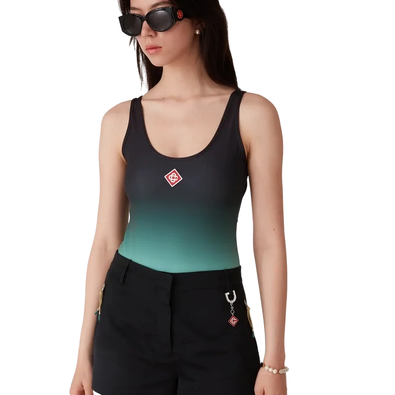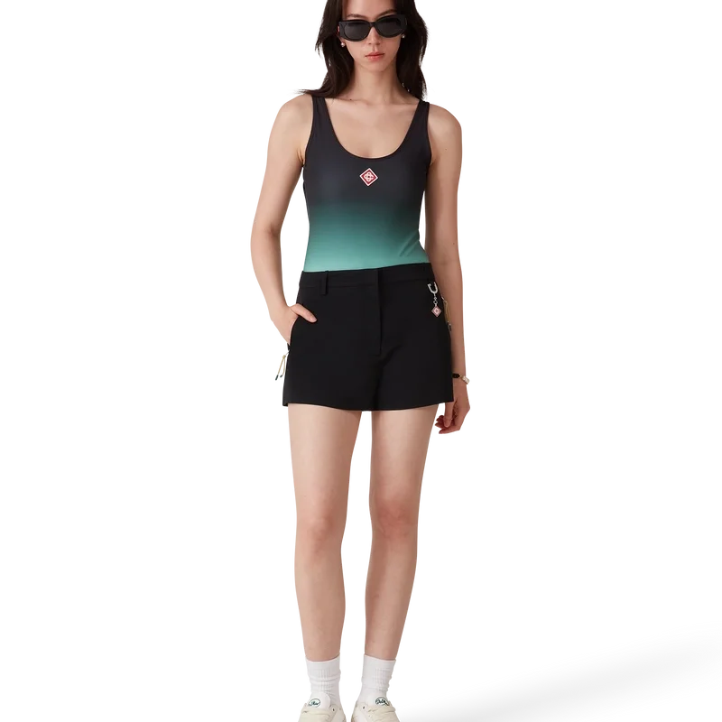 El traje de baño degradado es un diseño estampado confeccionado con un tejido técnico transpirable para baño, que presenta un degradado en color menta inspirado en la paleta de colores del Park Hyatt, un emblemático hotel de Tokio que utiliza el menta y el negro en su diseño interior. Se completa con corte alto en las piernas, cuello redondo, espalda con aberturas y el logotipo de diamante característico de la casa en el pecho.
