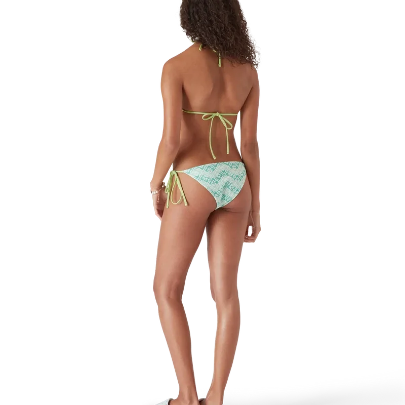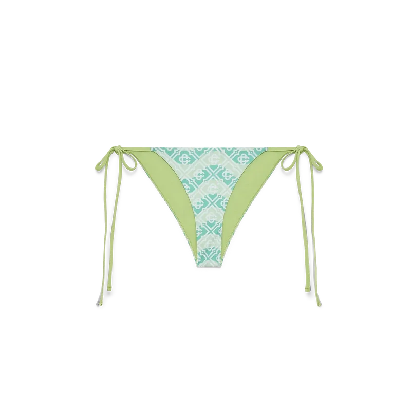 La braguita de bikini de tiras con monograma ondulado es un diseño refinado que presenta el patrón de monograma de la casa sobre un fondo inspirado en las ondas de Memphis.