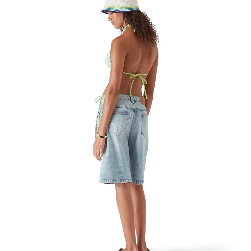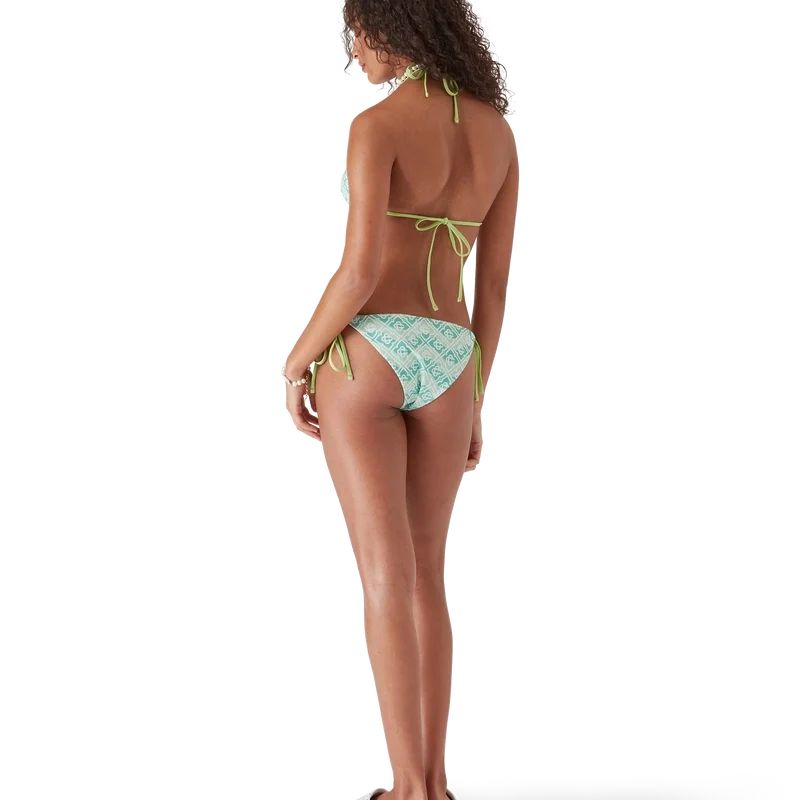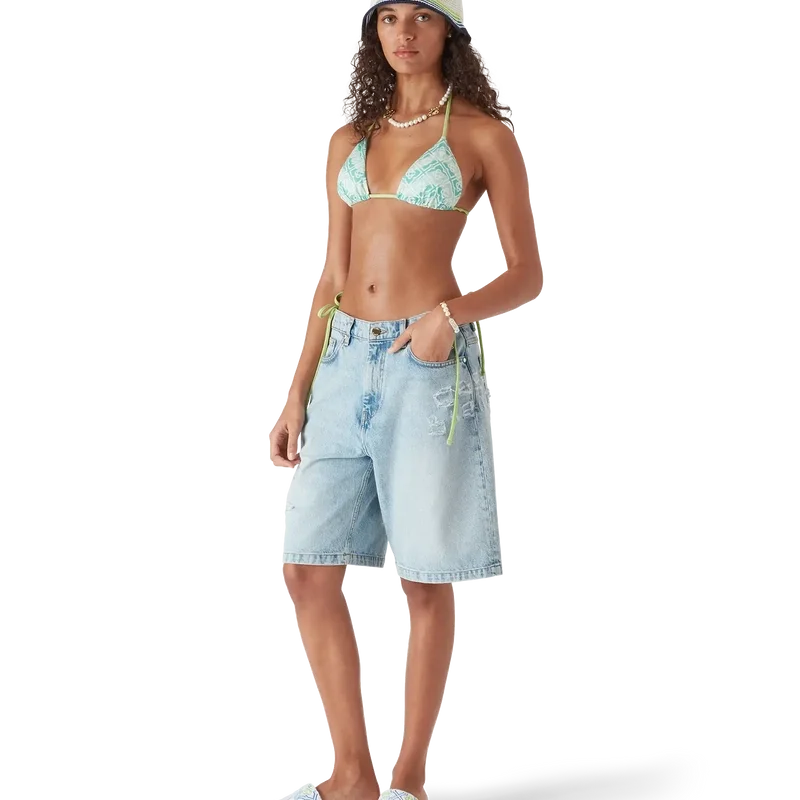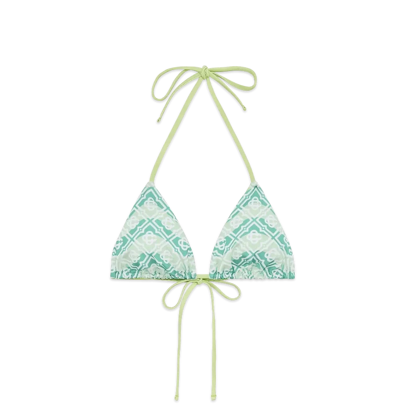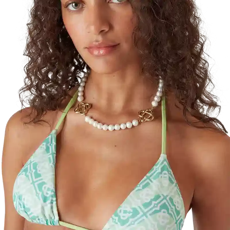 El top de bikini triangular con tiras y monograma ondulado presenta un diseño refinado con el patrón Monogram de la casa sobre un fondo inspirado en las ondas de Memphis. Completado con cierre de tiras con puntas doradas, copas extraíbles y el remache entrelazado CC chapado en oro característico de la casa en la copa izquierda, esta pieza está diseñada para llevarse con la braguita de bikini a juego.