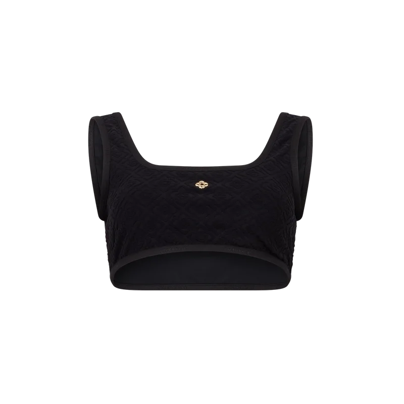 El top de bikini de jacquard Monogram está confeccionado con un tejido técnico de baño transpirable y cuenta con el remache entrelazado CC chapado en oro característico de la casa. Con tirantes, esta pieza está diseñada para llevarse con la braguita de bikini a juego.