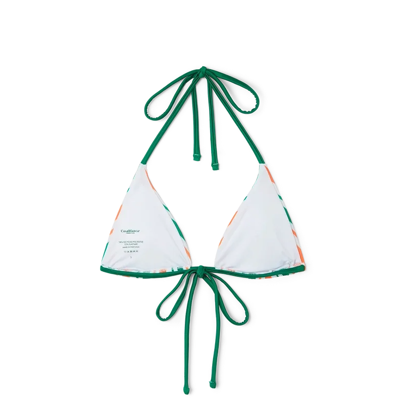 El top de bikini de tiras a rayas es un modelo de corte triangular con colores de temporada y cierre de tiras verdes en el cuello y la espalda. Esta prenda cuenta con relleno extraíble y está diseñada para llevarse con la braguita a juego.