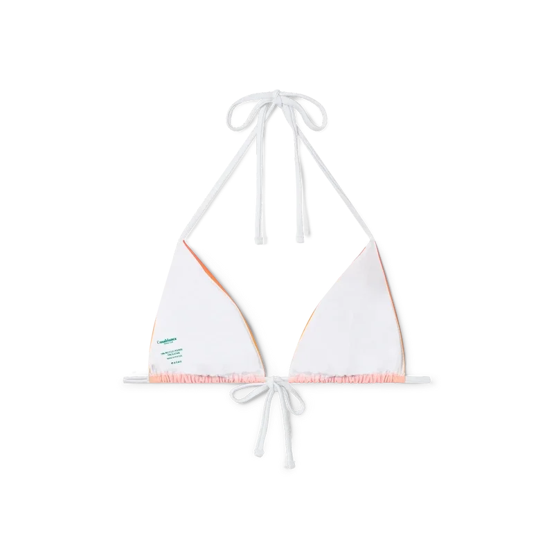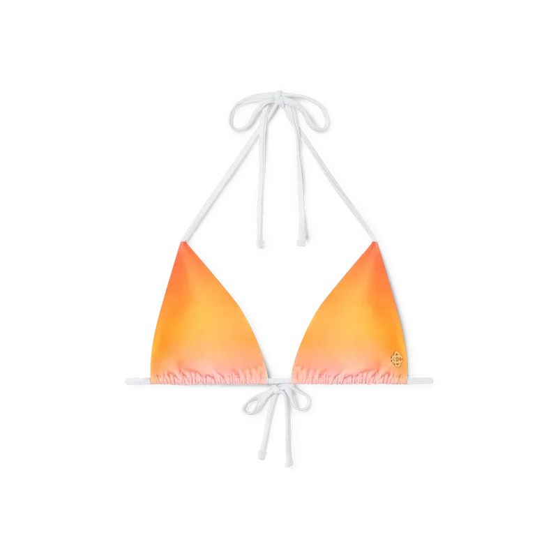El top de bikini degradado es un diseño triangular estampado confeccionado en tejido de mezcla de poliéster, con los colores degradados de esta temporada. La paleta de colores de esta colección es ligera e idealista, y enfatiza los temas etéreos que caracterizan a nuestra marca. Completado con tiras blancas en contraste para el cierre en el cuello y la espalda, copas con soporte extraíbles y el remache entrelazado CC chapado en oro característico de la casa en la copa izquierda, esta pieza está diseñada para llevarse con la parte de abajo del bikini a juego.