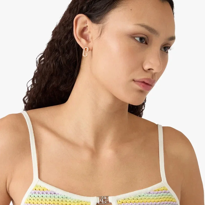 El minivestido a rayas Bourgeois es un diseño de punto refinado, con elegantes detalles de rayas horizontales. Se completa con tirantes finos en contraste, el logotipo de la casa en plata chapada en el pecho y un diseño con abertura en forma de ojo de cerradura, con una silueta favorecedora que encarna el enfoque sofisticado de la casa en cuanto al Punto.