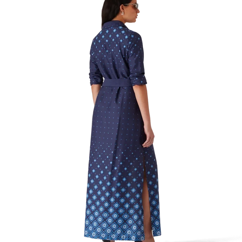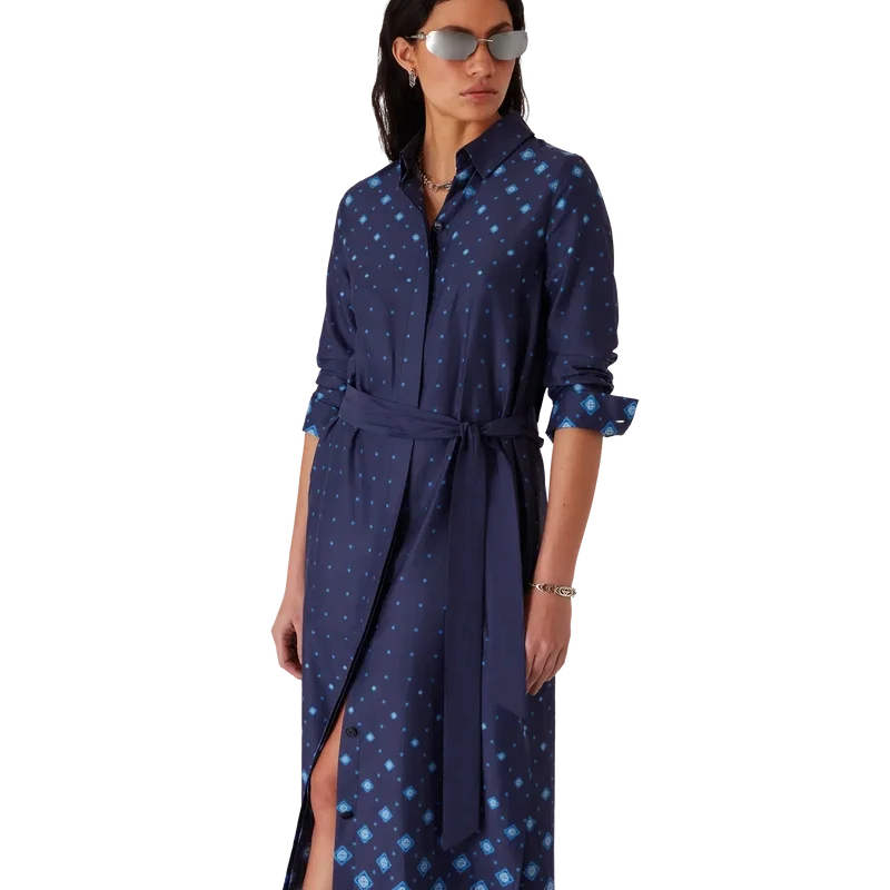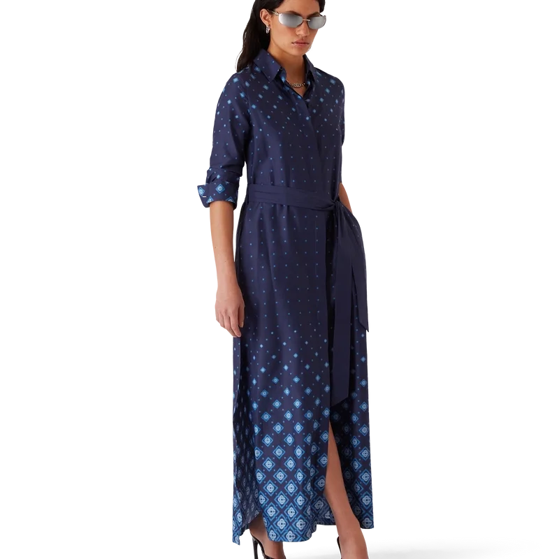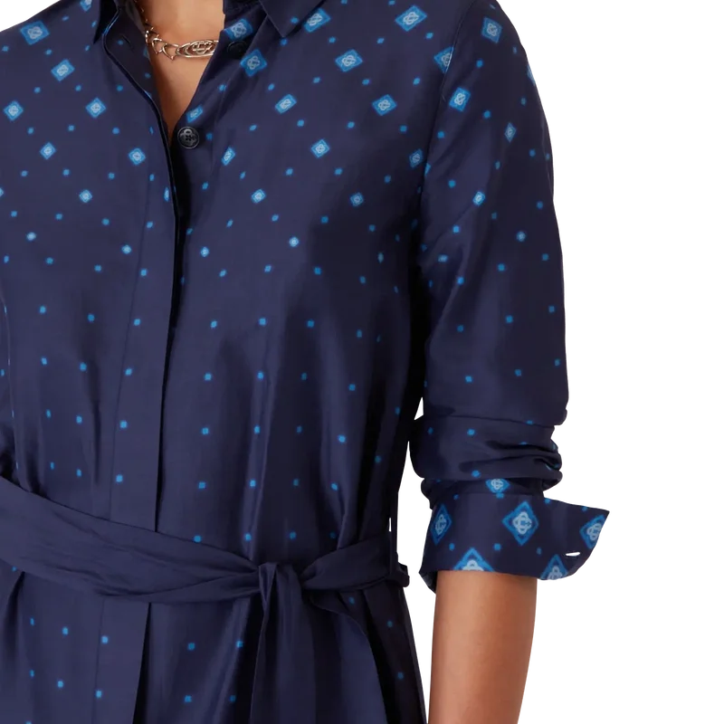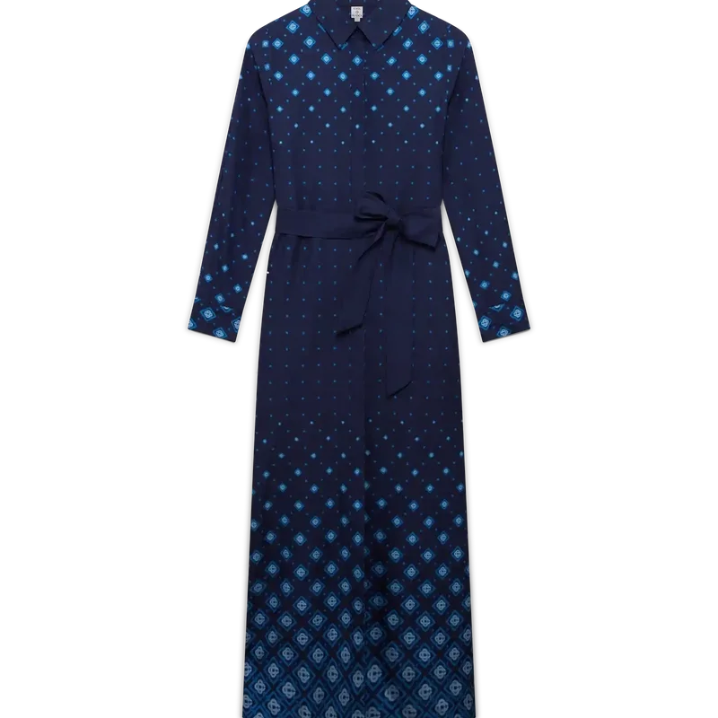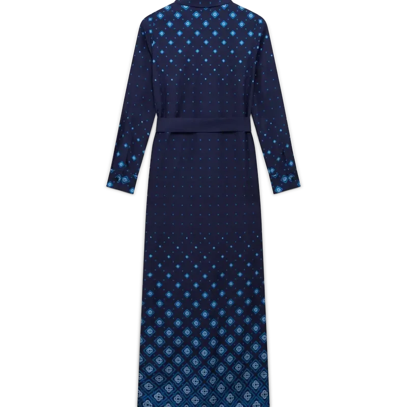 El vestido camisero de seda con degradado es un diseño clásico de manga larga y corte largo que presenta el estampado degradado con el monograma característico de la casa, donde los degradados tonales caen en cascada a lo largo de la silueta. Se completa con un cuello en punta, cierre con botones, botones de corozo con el logotipo CC entrelazado, presillas para cinturón, un cinturón textil a tono y botones esmaltados con borde dorado en el cuello y los puños.