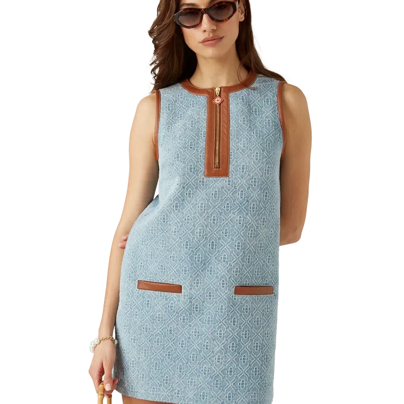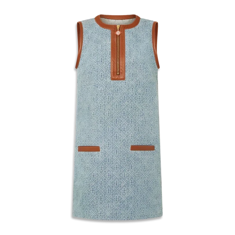 El vestido de mezclilla con monograma es un diseño mini sin mangas de corte recto confeccionado en tela de mezclilla de mezcla de algodón.
