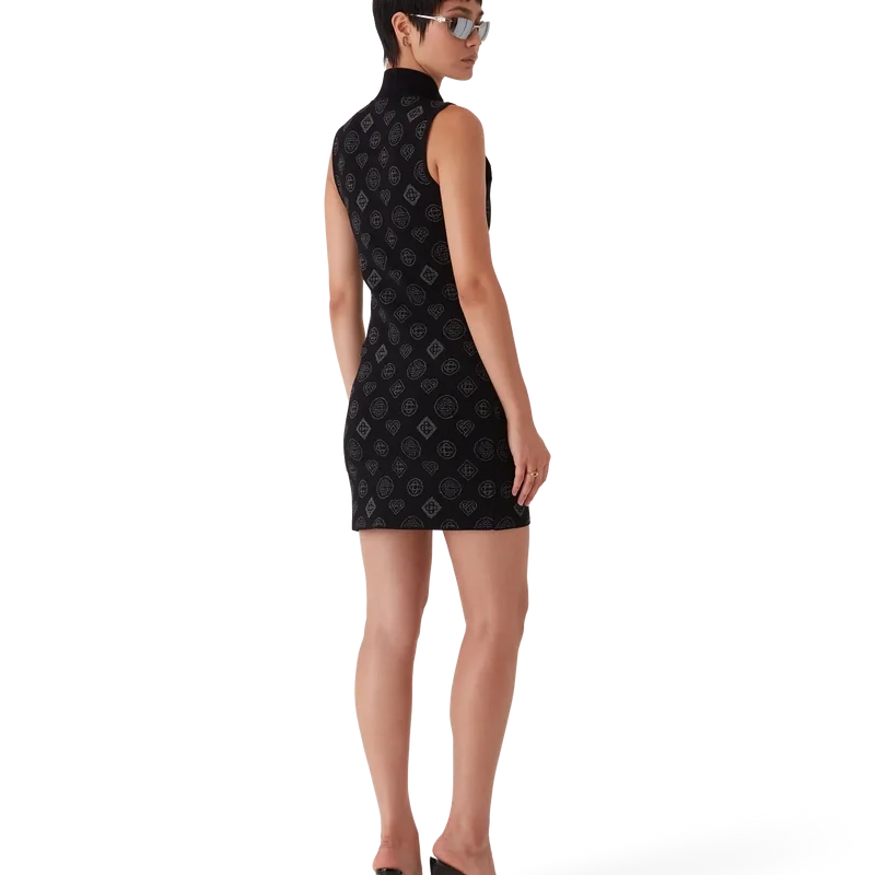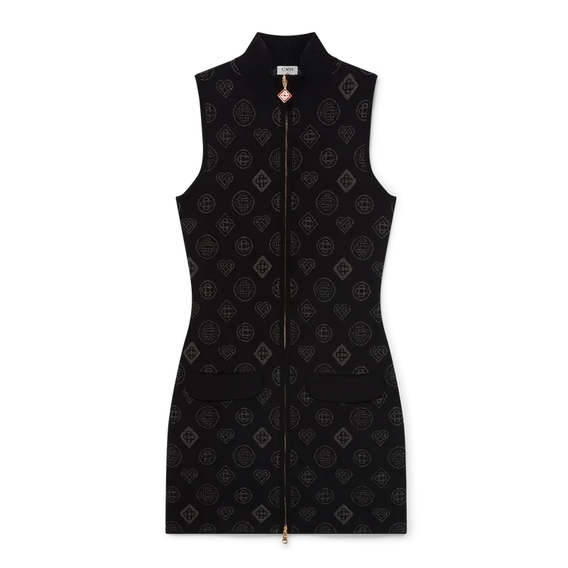 El vestido de jacquard Monogram es un diseño mini sin mangas y de corte en A confeccionado en un tejido de mezcla de poliéster con el logotipo Honeydrew de la casa repetido en un sutil estampado negro sobre negro. Se completa con cierre de cremallera frontal con la lengüeta con el logotipo del diamante característico de la casa, cuello de banda y bolsillos con solapa.