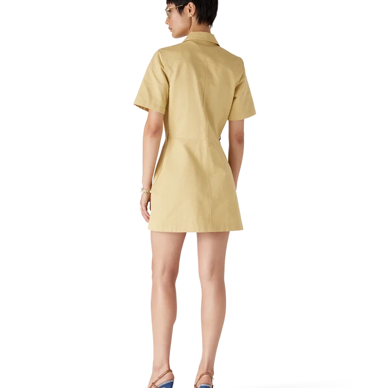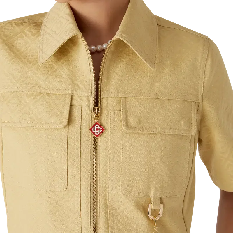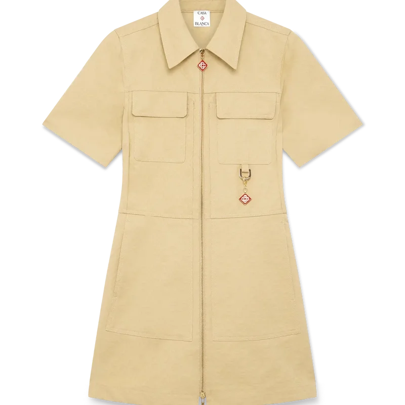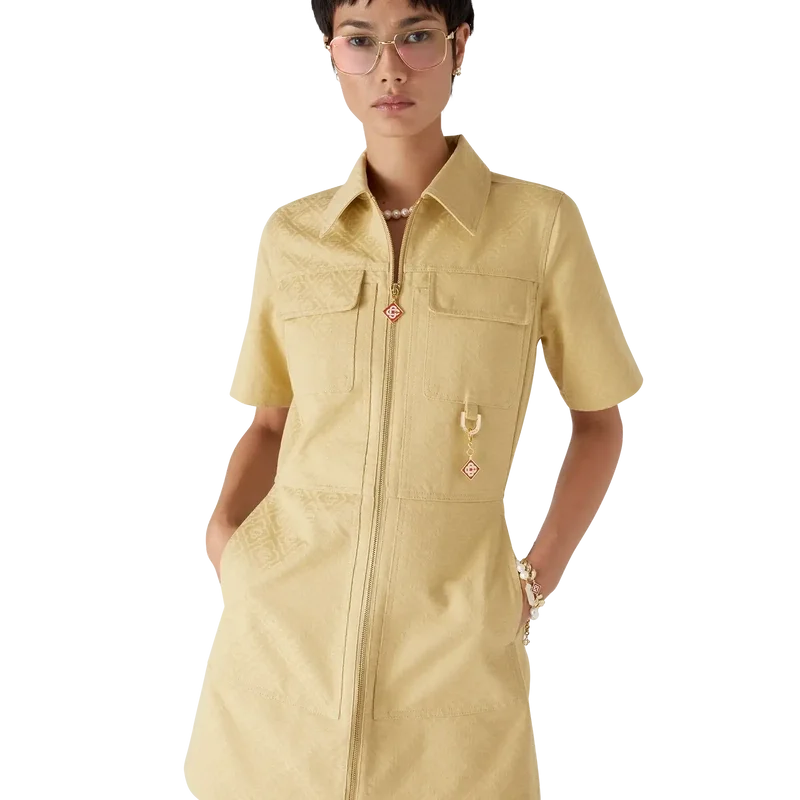 El vestido de jacquard de algodón con monograma es un minivestido de manga corta y corte en A confeccionado en tejido de jacquard de algodón con monograma. Se completa con cuello en punta, cierre frontal con cremallera que incluye la lengüeta con el logotipo de diamante característico de la casa, bolsillos de parche y bolsillos con solapa.