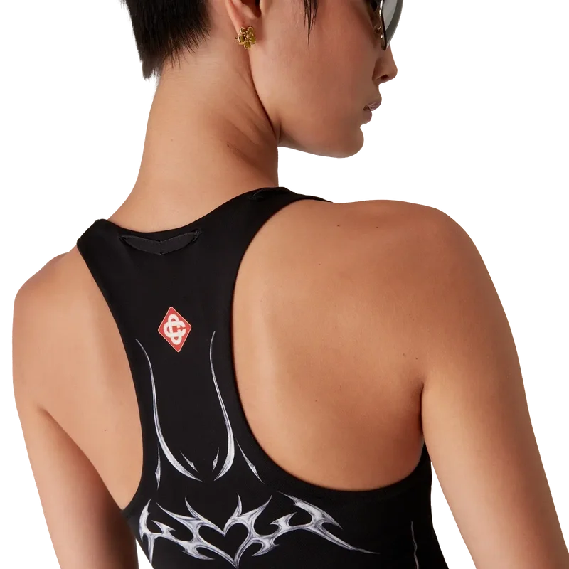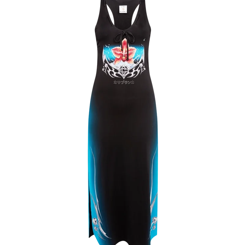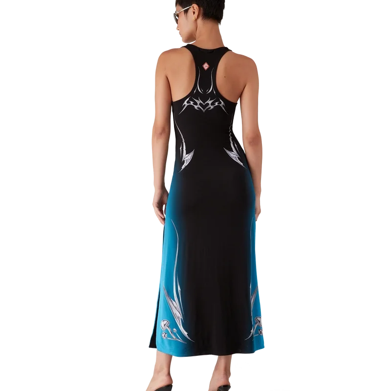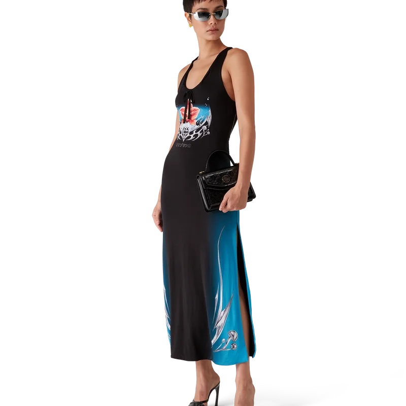 El vestido de jersey ceñido Blades es un diseño maxi estampado y sin mangas que presenta el diseño artístico Blades de esta temporada, el cual juega con el contraste entre dos sensaciones opuestas: la nitidez de la hoja y el frío cromo plateado, en contraste con la calidez de la naturaleza, como los tonos rosa y rojo intensos de una flor de orquídea. La incorporación de gotas de agua aporta un elemento fresco y nítido al diseño. Se completa con un cuello redondo y una espalda nadadora.