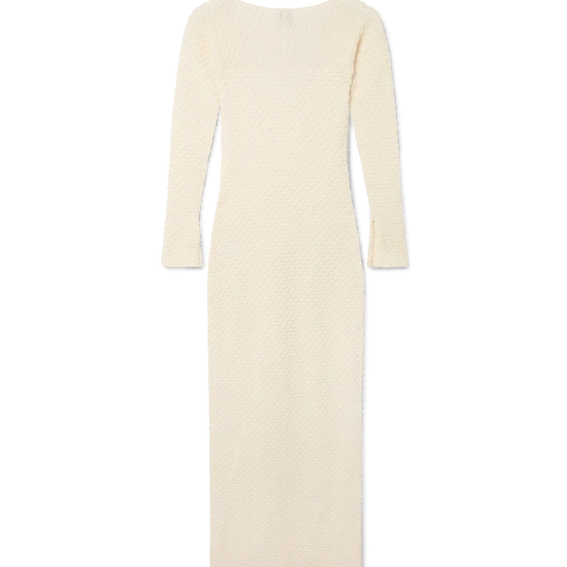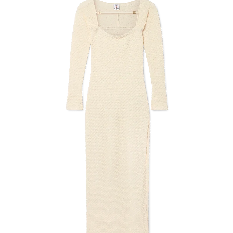 El vestido de punto texturado es un modelo largo de manga larga confeccionado en tejido de mezcla de algodón. Se completa con un cuello barco, mangas con aberturas y una abertura en el dobladillo hasta el muslo.