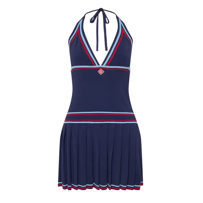 El vestido halter plisado es un modelo mini con un corpiño ajustado confeccionado en tejido de punto con el logotipo de diamantes característico de la casa.