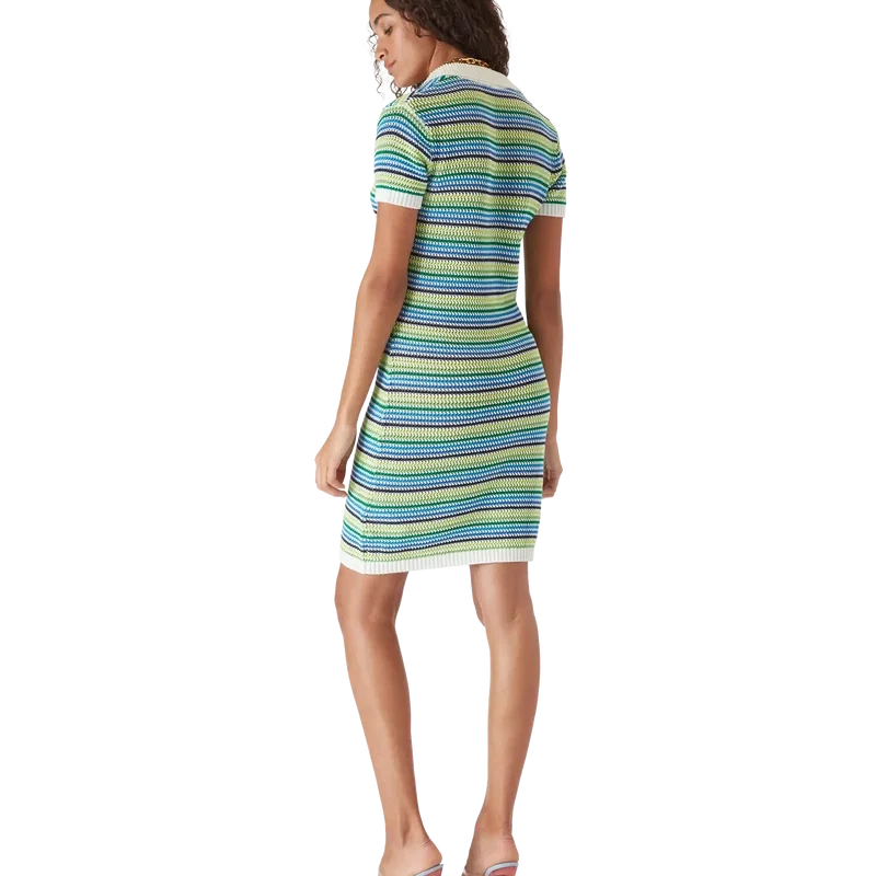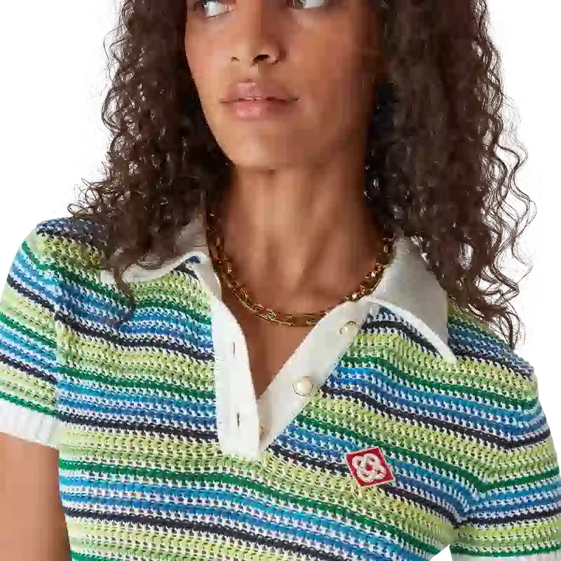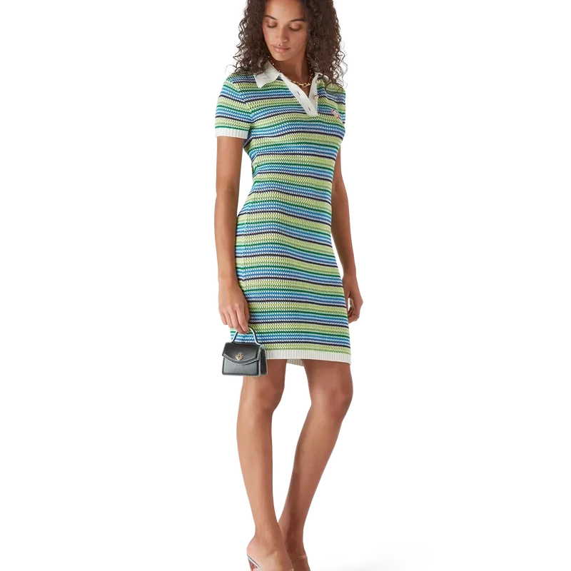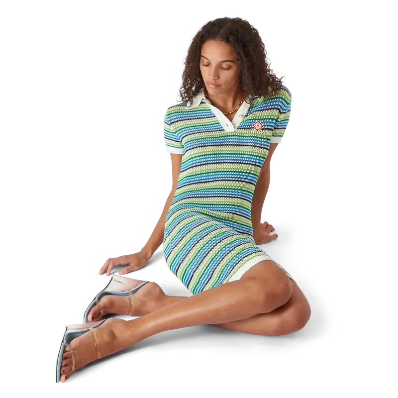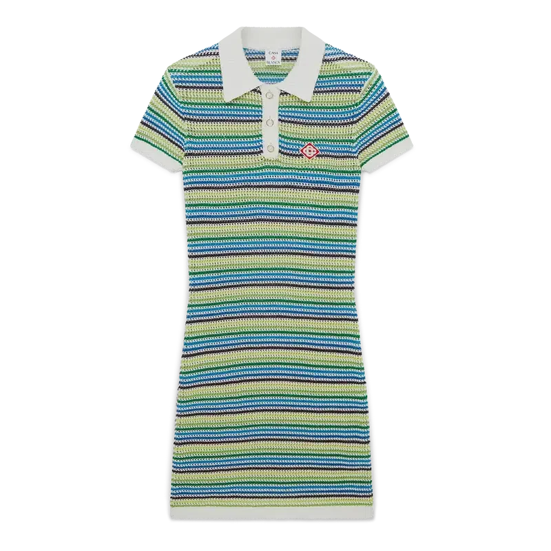 El vestido a rayas es un diseño de estilo mini que presenta el cuello con el logotipo de diamante de la casa, mangas cortas y silueta de vestido midi. Se completa con el patrón de rayas característico de la casa, detalles del logotipo de diamante y un sofisticado acabado de punto que captura una elegancia refinada.