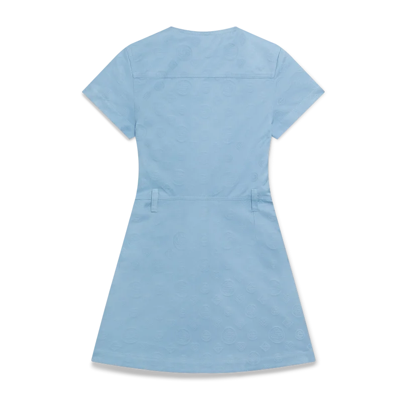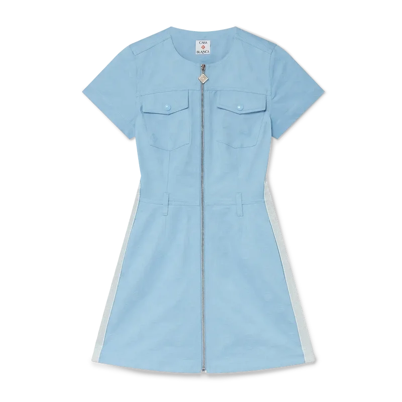 El vestido Monogram es un vestido mini de corte A y manga corta, con el icónico estampado Monogram de la casa. Se completa con un cierre de cremallera frontal con la lengüeta con el logotipo de diamante característico de la casa, presillas para cinturón, bolsillos en las costuras, bolsillos con solapa y detalle de panel de seda.