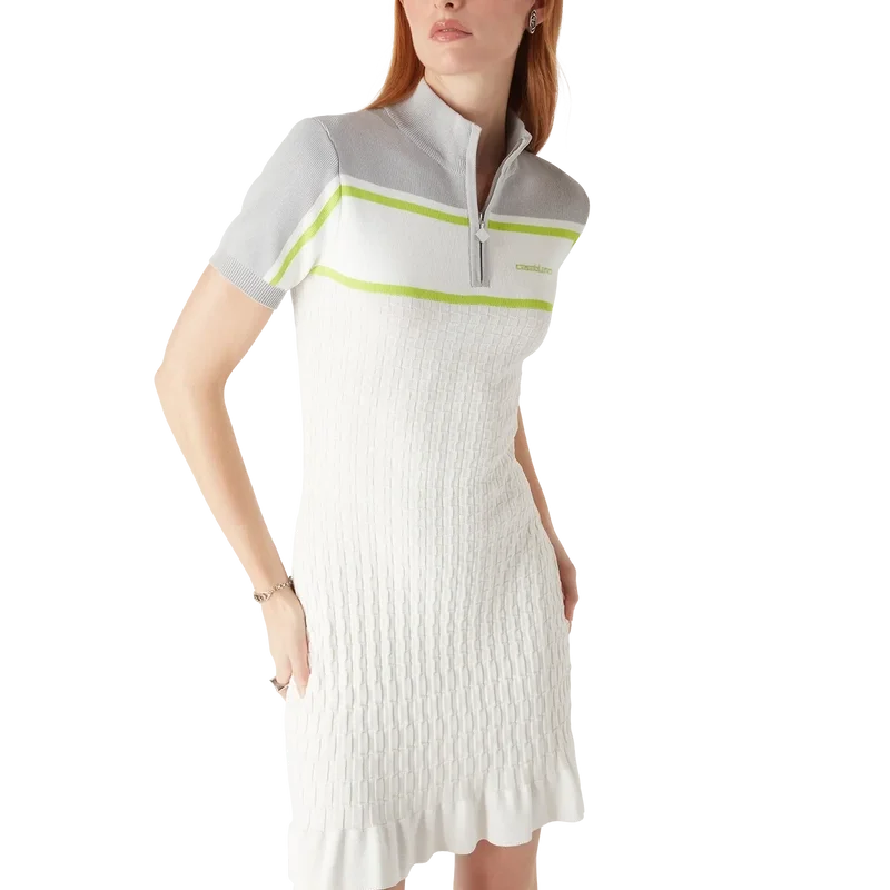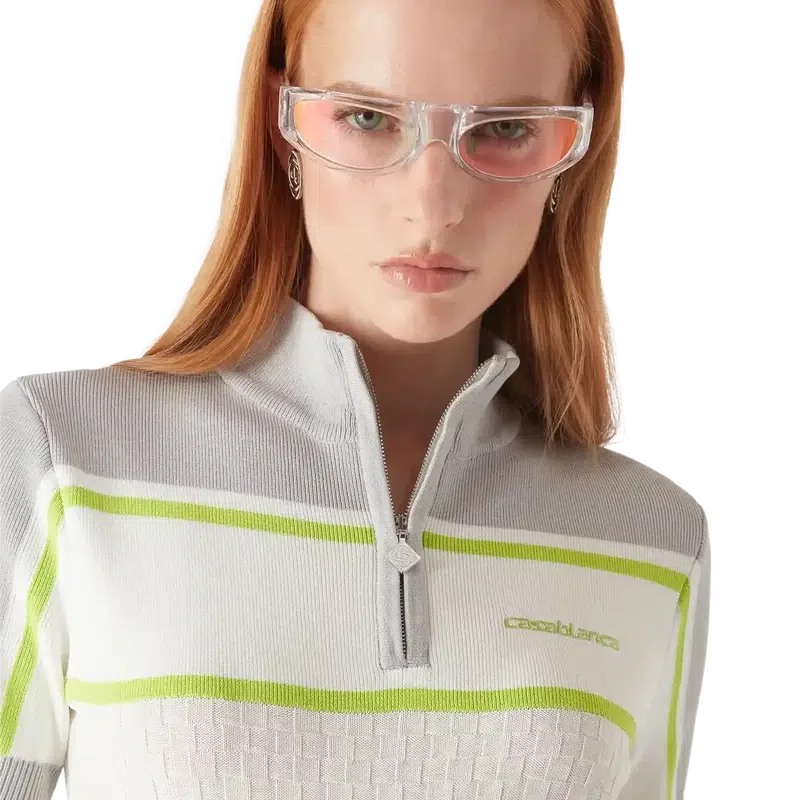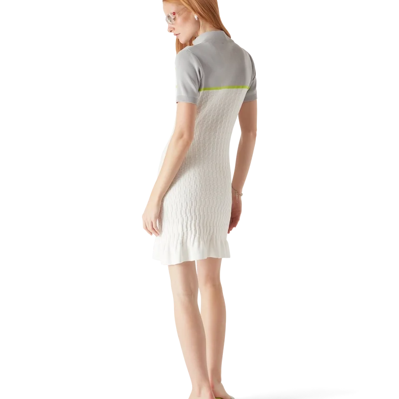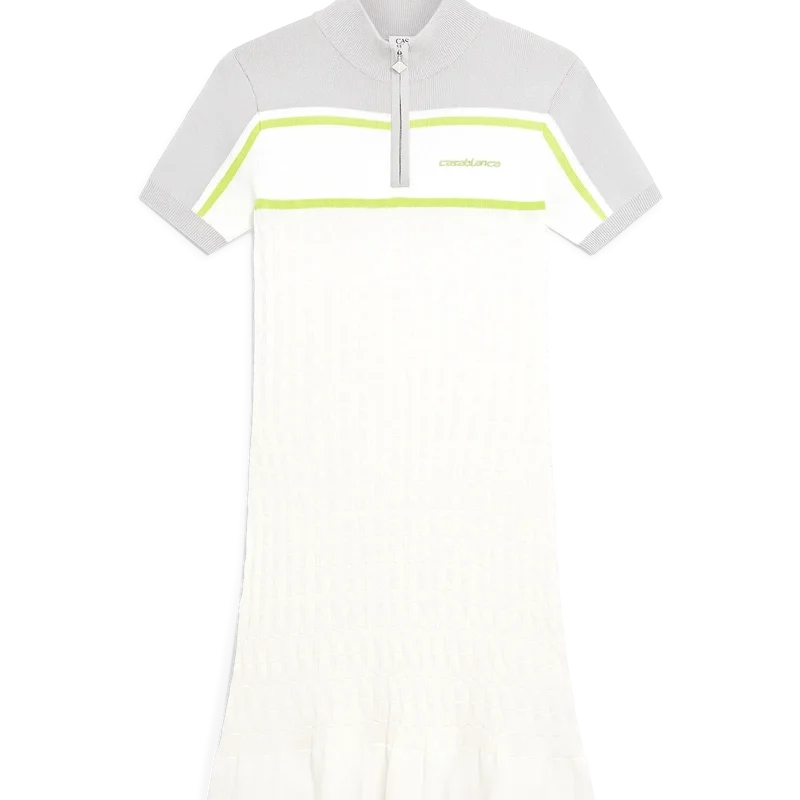 El vestido polo de tenis es un diseño de punto de manga corta con hombros y mangas exteriores en contraste. Se completa con un cierre de cremallera con la lengüeta con el logotipo del diamante característico de la casa, cuello alto, detalles a rayas, logotipo Casablanca característico, puños acanalados y detalles de volantes en el dobladillo.