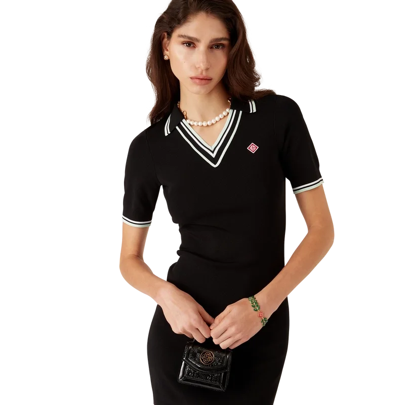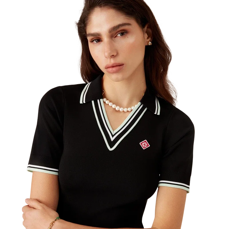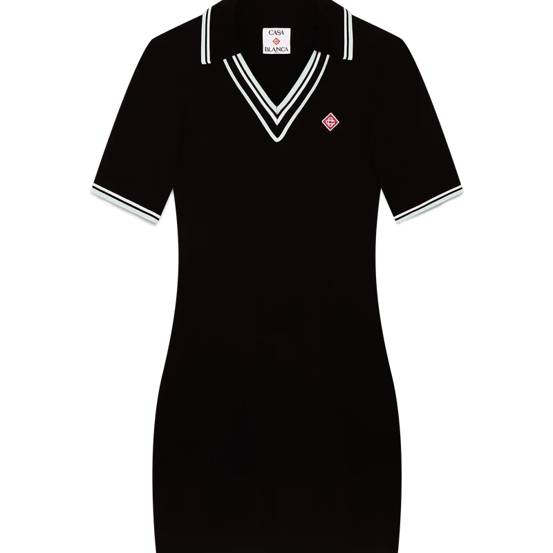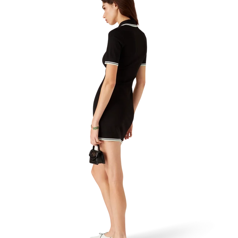 El vestido polo de viscosa con cuello en V es un diseño de manga corta confeccionado en tejido de punto con el logotipo de diamantes característico de la casa. Cuenta con cuello acanalado y detalles de rayas en negro, blanco y menta en el cuello, los puños y el dobladillo.