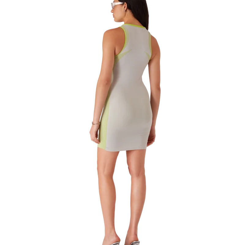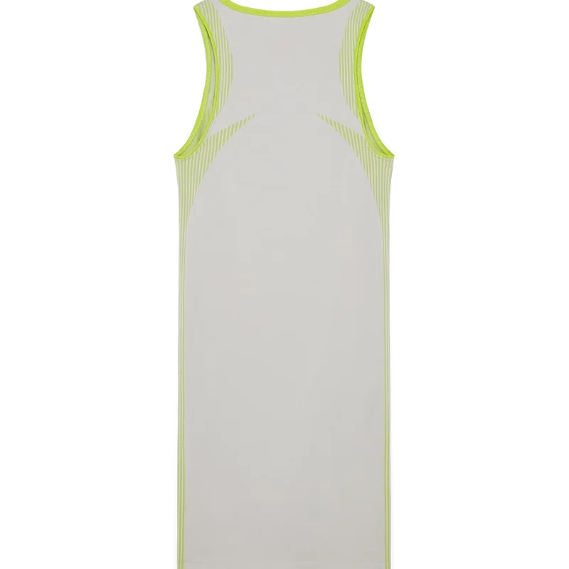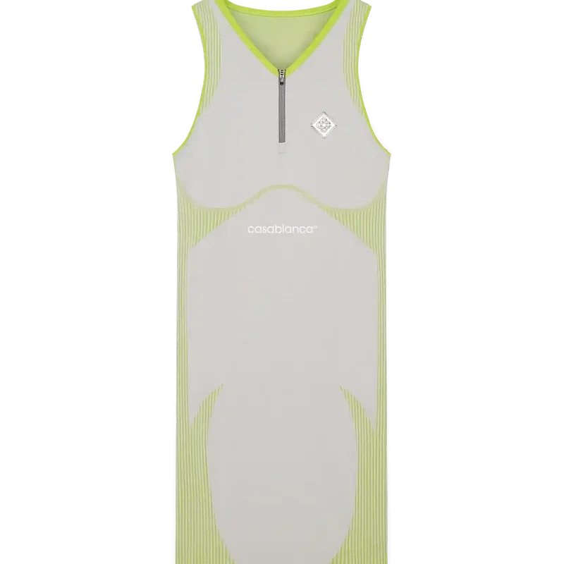El vestido sin costuras es un diseño ajustado sin mangas que luce el logotipo del diamante plateado de la casa y el logotipo de Casablanca en el centro. Se completa con un escote en V poco pronunciado, un cierre de cremallera con la lengüeta con el diamante característica de la casa y paneles de refuerzo para mayor sujeción.