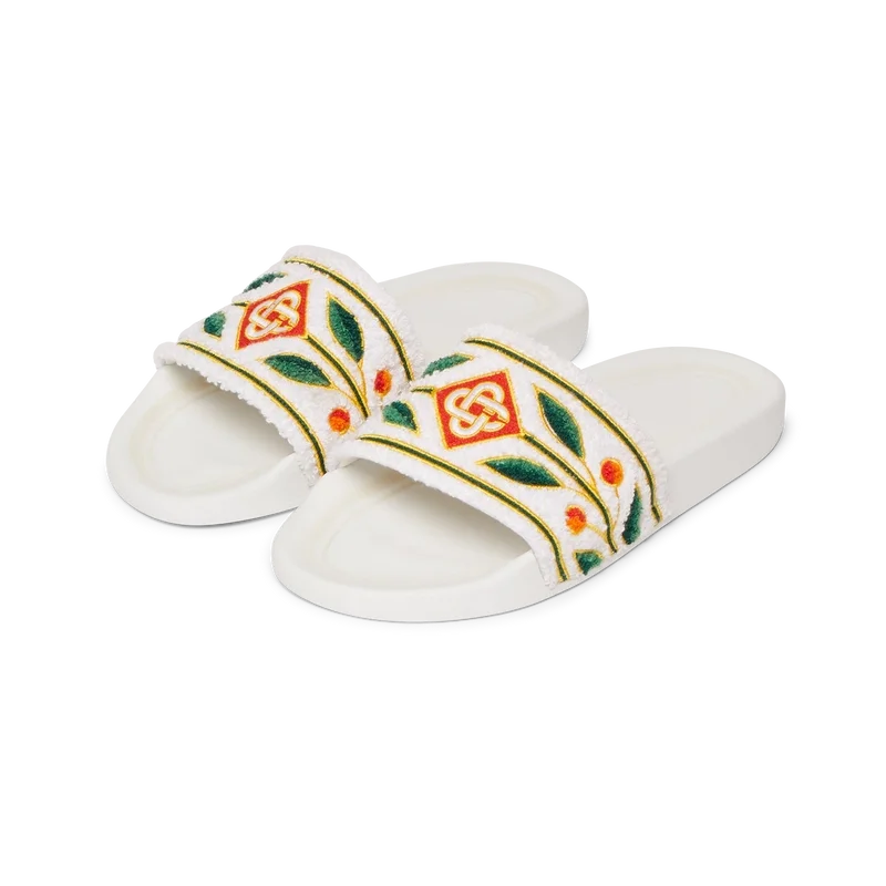 Las sandalias de felpa bordada lucen el logotipo del diamante de la casa y el diseño característico de la corona de laurel en la parte superior. Se completan con una plantilla moldeada para mayor comodidad y una suela de goma texturizada que combina rendimiento y estilo casual.