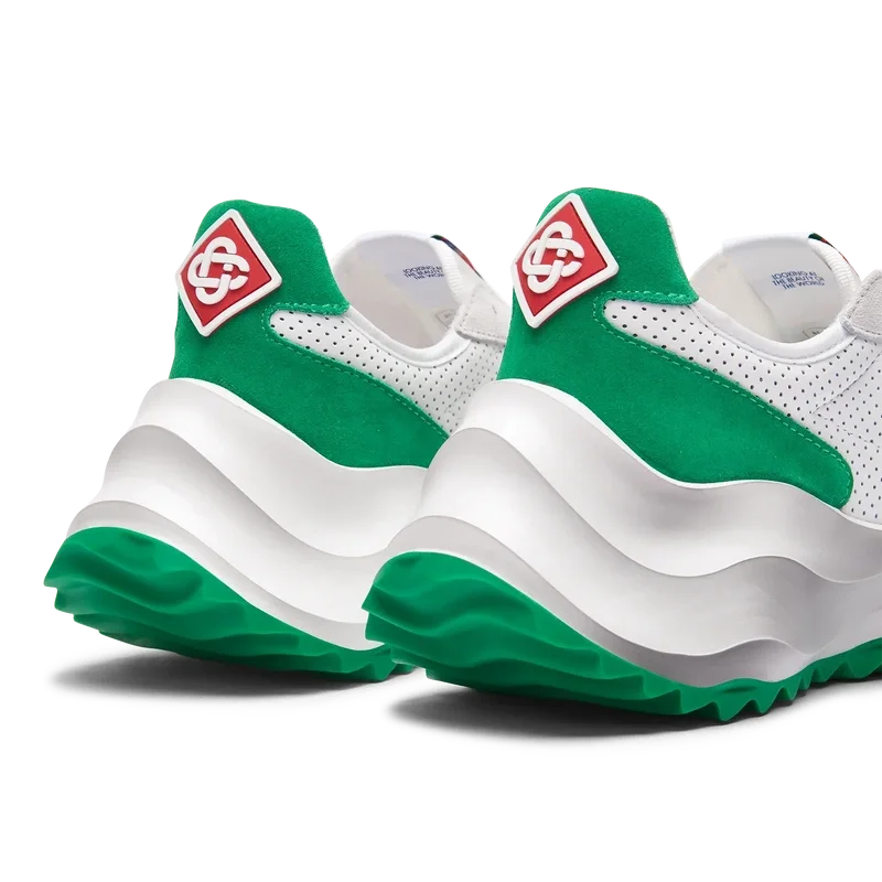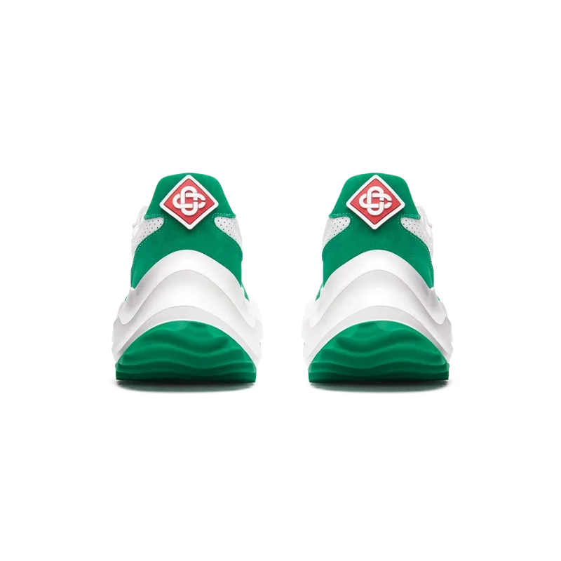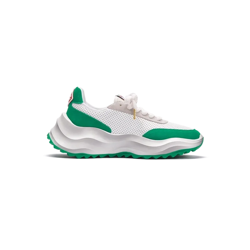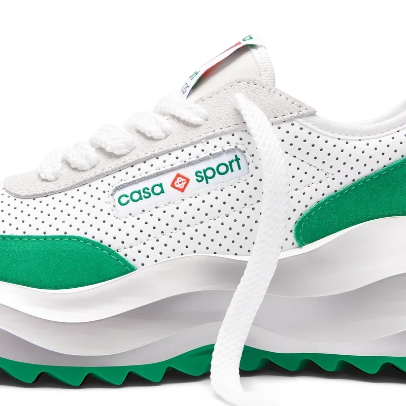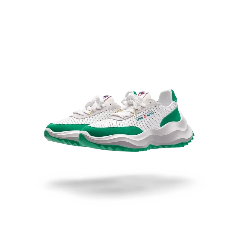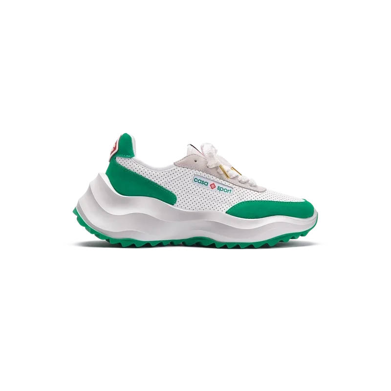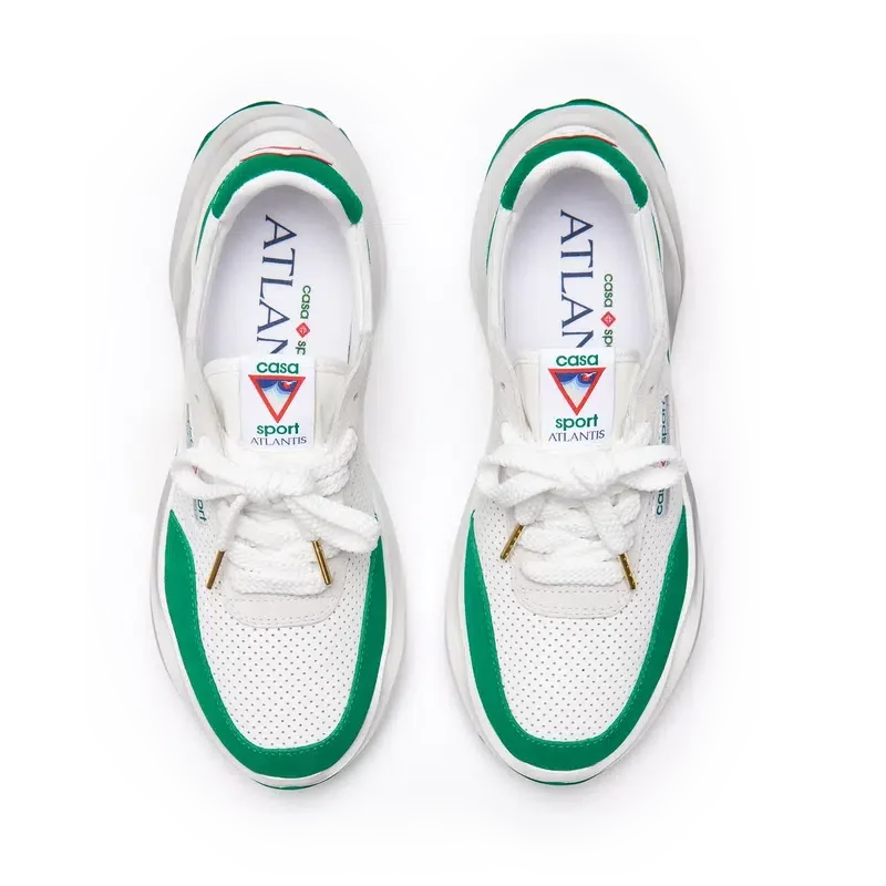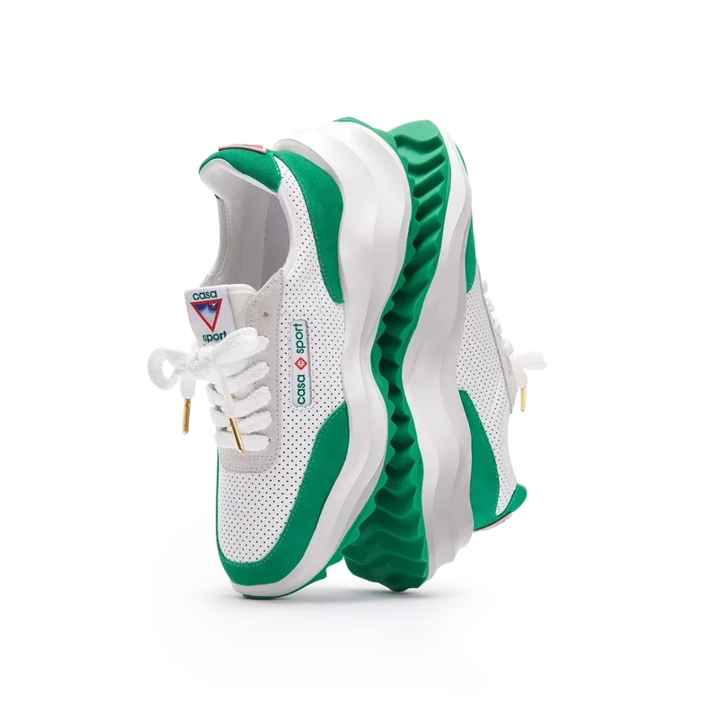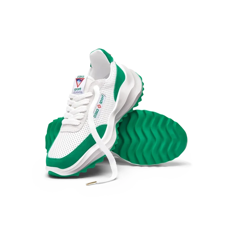 Verde tonalRevestimientos de gamuza, parte superior de cuero perforado, cordones de gamuza en contraste, parche de goma con el diamante de Casablanca en la lengüeta del talón, lengüeta lateral tejida con la marca Casa Sport, etiqueta Atlantis tejida en la lengüeta, entresuela Eva Wave esculpida, suela exterior de goma, puntas de cordones doradas