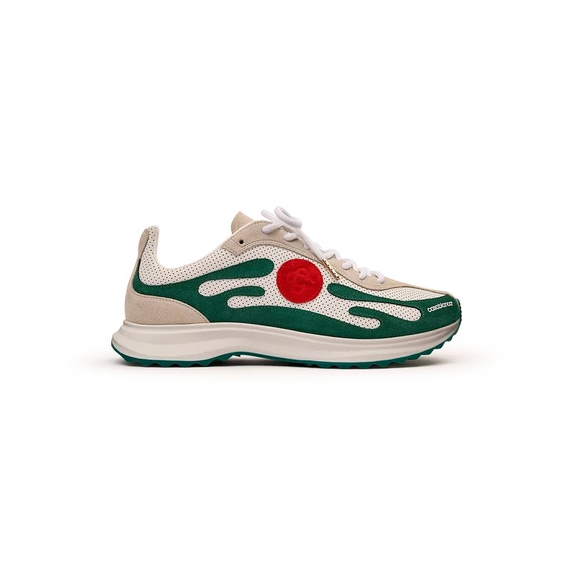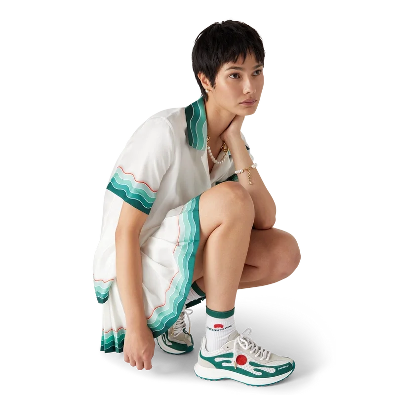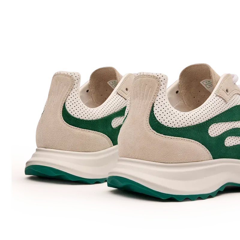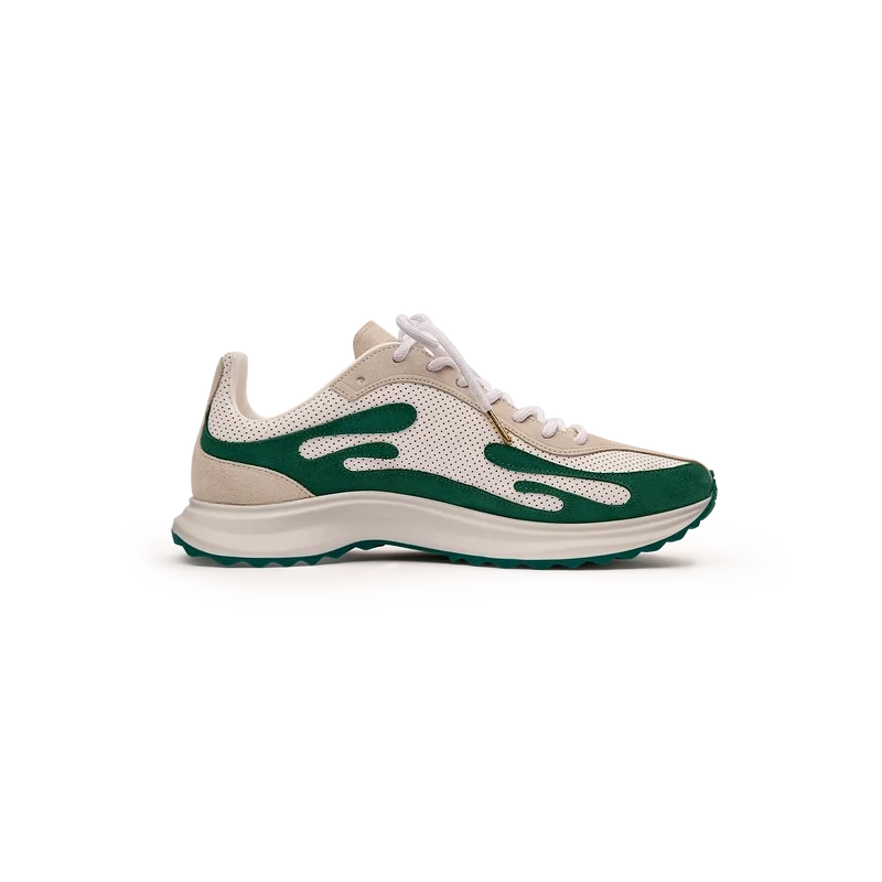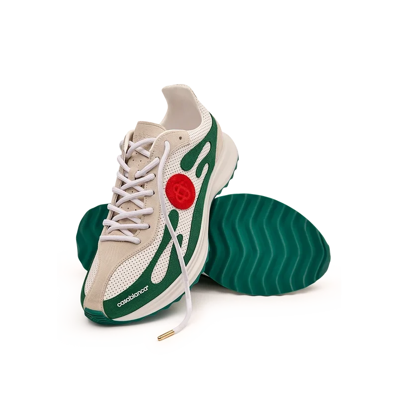 Los zapatos Stade para mujer en blanco y verde toman su nombre de la antigua medida griega para la distancia de una carrera a pie, que más tarde se convirtió en la palabra «estadio». El estilo se inspira en los zapatos de running de alto rendimiento y es una transferencia de la tecnología moderna a la tradición antigua; los códigos del running moderno, con la malla ligera y el estampado brillante, añaden modernidad. La suela presenta curvas esculpidas, que son una referencia a nuestro modelo Atlantis y un elemento característico del diseño Casablanca.