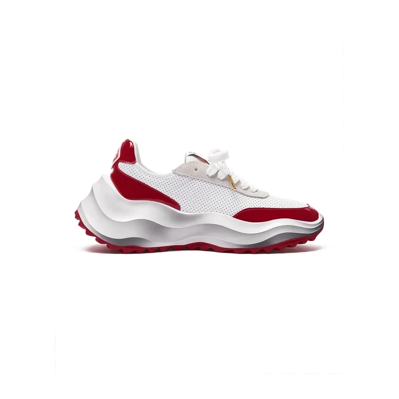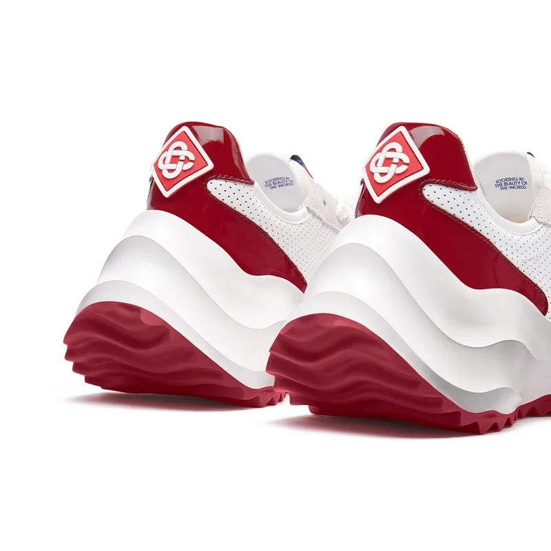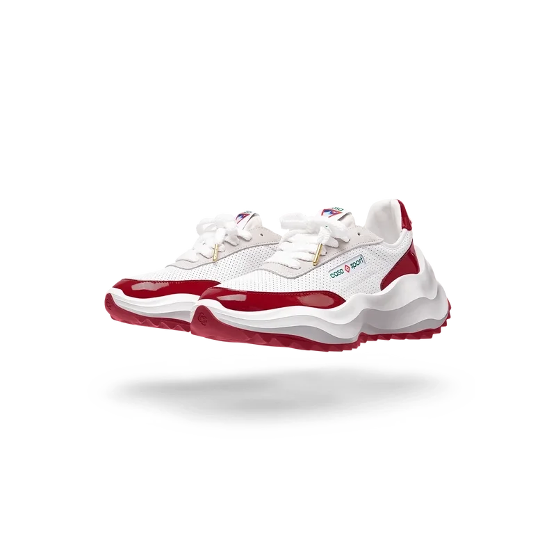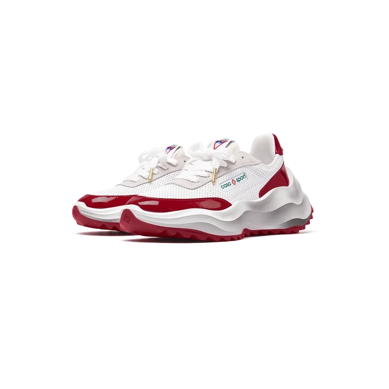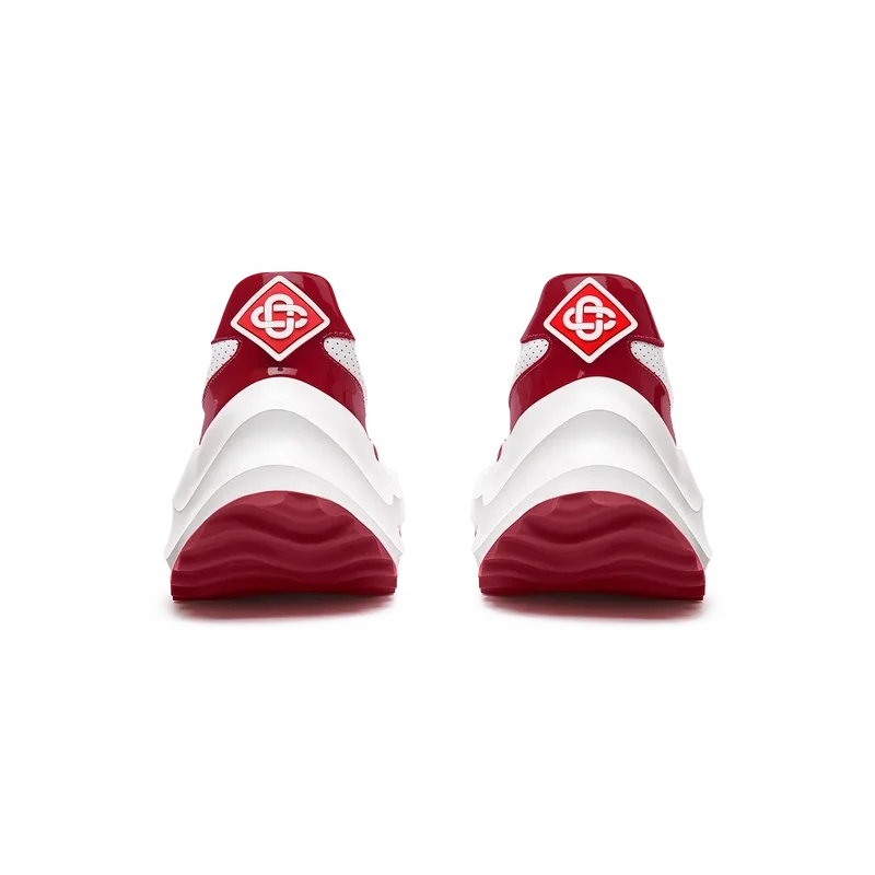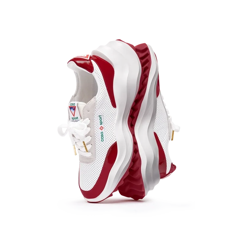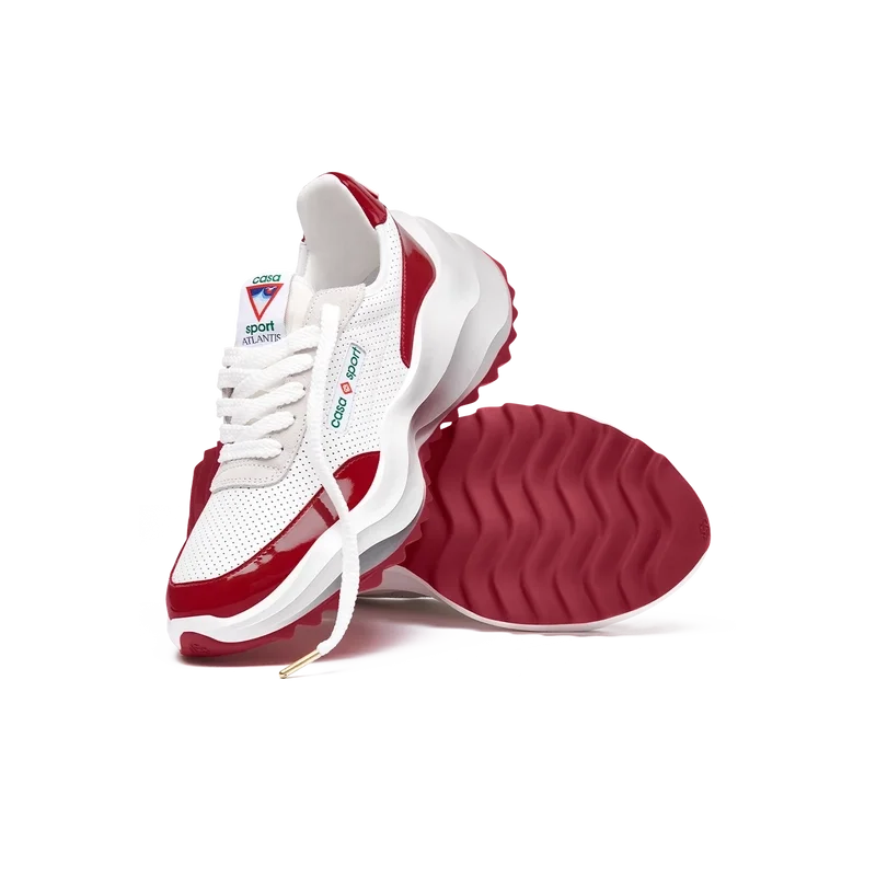 Revestimientos en charol rojo Haute a tono, parte superior de cuero perforado, cordones de gamuza en contraste, parche de goma con el diamante de Casablanca en la lengüeta del talón, lengüeta con la marca Casa Sport tejida en el panel lateral, etiqueta Atlantis tejida en la lengüeta, entresuela Eva Wave esculpida, suela de goma, puntas de cordones doradas