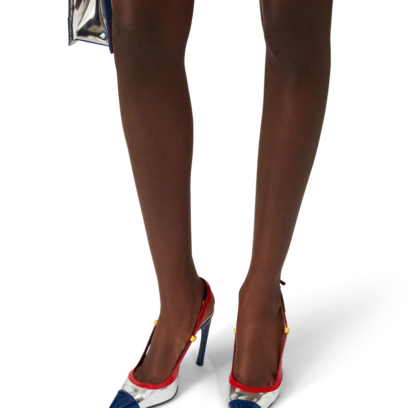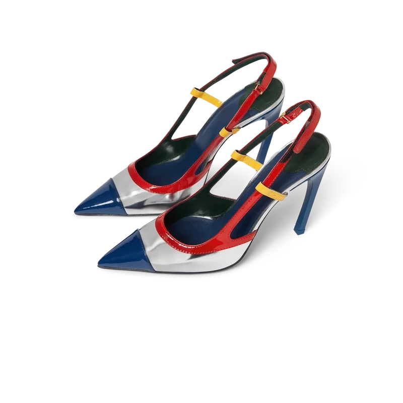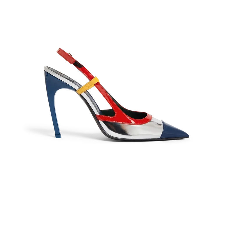 Los zapatos de tacón con tiras traseras y arco cromado son de estilo tacón de aguja, confeccionados con una parte superior de piel de becerro charol multicolor. Se completan con piel roja, amarilla y cromada, tacones de aguja de color azul, tiras en el talón y suelas de piel.